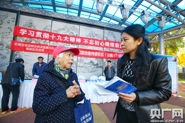 “老百姓經(jīng)常遇到非法開展殯儀活動、非法公墓等行為,不僅利益遭受很大損失,而且服務(wù)也得不到保障。另外,還有一些非法養(yǎng)老機(jī)構(gòu)打著養(yǎng)老的旗號從事非法活動,甚至還有一些社會組織以各種名義騙取錢財。”北京市民政綜合執(zhí)法監(jiān)察大隊大隊長王業(yè)涌表示,“開展‘民政法治宣傳進(jìn)社區(qū)’活動,希望能多和老百姓接觸,加強(qiáng)民政執(zhí)法宣傳,提高老百姓對民政執(zhí)法的了解,進(jìn)一步保護(hù)合法權(quán)益。同時,現(xiàn)在正值十九大勝利閉幕之際,加強(qiáng)對十九大精神的宣傳也是我們此次活動的主要目的,真心希望社區(qū)居民能夠通過我們此次活動有所收獲。”