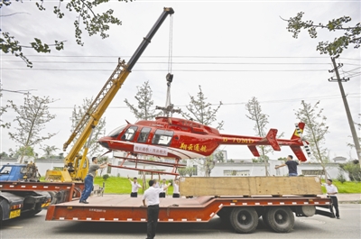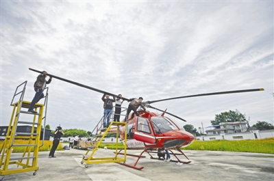 昨晨9點,成都商報記者在四川省旅游學院黃龍溪校區看到了整裝待發的救援隊伍,以及一架鮮紅色的直升機和一架白色直升機。“紅色的機型是貝爾407GXP,馬上趕到災區。白色的機型是羅賓遜R44,在成都待命!睏钜阏f。 受飛行條件限制,貝爾407GXP奔赴災區必須走陸路。在成都完成4片旋翼的拆卸后,這個紅色的大家伙被固定在一輛大掛車上,經過8小時的“長途托運”,終于在昨晚7點抵達了茂縣疊溪鎮排山營村小寨組的一片三四百平方米的平地,這是距新磨村受災核心區最近又最適宜起落的點位。楊毅說,26日早上9時,在飛行條件允許的情況下,貝爾407GXP會從這塊平地上起飛,直抵新磨村受災核心區!拔覀儠\送兩名國土資源部的地質專家,到相對高度300米左右的上空勘測山體上方地質,預測衍生災害發生的可能性!