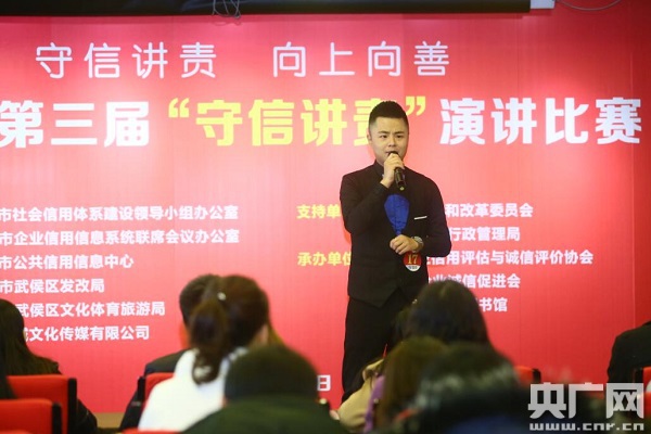 央廣網成都12月27日消息(記者韓民權)為貫徹落實“十九大”精神,踐行社會主義核心價值觀,積極推動成都市社會信用體系建設。12月27日,成都市第三屆“守信講責”演講比賽在成都武侯區(qū)圖書館舉行。30余位選手圍繞“守信講責 向上向善”的主題上演了精彩演講。
