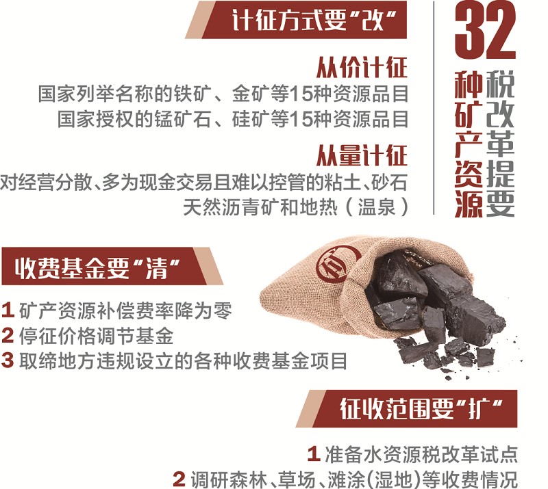 對于計征方式要“改”。按通知要求,對國家列舉名稱的鐵礦、金礦等15種資源品目實行從價計征;對經營分散、多為現金交易且難以控管的粘土、砂石,仍實行從量計征。按照國家授權,對錳礦石、硅礦等15種資源品目征收資源稅。其中,除天然瀝青礦和地熱(溫泉)實行從量計征外,其余品目一律實行從價計征。