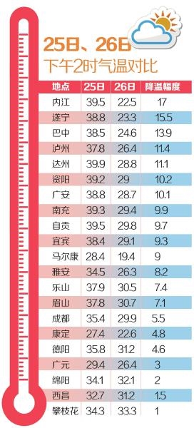 出伏的第一天,全省各地的氣溫紛紛迫不及待地跳水。對比26日下午2時與25日下午2時的氣溫,內江從39.5℃降到22.5℃,溫度排名從第二變成倒數第二,夠任性。不過,17℃的溫差,一下子從熱得發慌的夏天,變到風輕云淡的秋天,不知道小伙伴們適不適應。