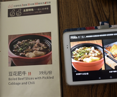 通過翻看IPAD上的菜價,記者發現,“陳香櫻桃肉”貴20元,“豆花肥牛”貴14元,至少有10多種菜比門前菜單上的標價貴。“明爐生焗蝦”貴19元,“風暴干鍋蛙”貴16元……在記者對比的菜品中,大部分菜品都要貴上10多元,差價最高的達30元。