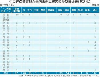 據了解,8日的群眾來電來信舉報投訴共反映117個環境問題,其中涉及水污染28件、大氣污染16件、土壤污染1件、生態破壞3件、垃圾污染33件、噪聲污染14件、油煙污染9件、揚塵污染1件、其他問題12件。