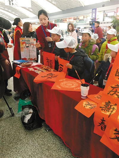雙流機(jī)場工作人員帶“小候鳥”們寫福字