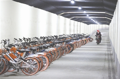 隧道內停放了許多共享單車,因隧道無信號無法使用