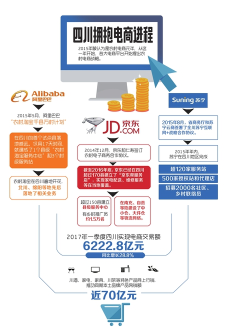 四川是農業大省,自2014年以來,包括京東、阿里、蘇寧等主流電商企業已經注意到了這塊巨大的農村電商蛋糕,并且開始了搶灘大戰。在這幾年的過程中,它們對四川的農村帶來了許多改變。