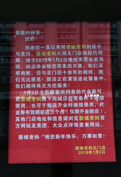 三層樓的蓉城老媽火鍋總店仍然在北門大橋旁邊佇立著,但是已經(jīng)關(guān)門停業(yè)了,窗戶玻璃上掛著告示,“閉店停業(yè)給您帶來的不便,我們深感抱歉。您與北門店十余年的陪伴,我們無比感恩。”蓉城老媽方面承諾,之前顧客所持有的代金券可在蓉城老媽旗下同城店同等條件下繼續(xù)使用,也可于新店開業(yè)時繼續(xù)使用。