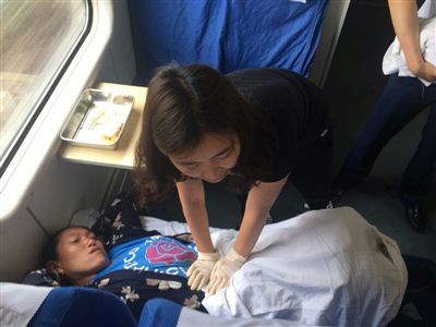 這時,有著7年新生兒科工作經驗的護士董文靜聽到廣播迅速趕來,幫助這名孕婦接生。在董文靜等人的幫助下,這名孕婦順利產下一名女嬰。但是,由于孕婦產后胎盤不能順利娩出,加上列車上的醫療條件有限,孕婦依然有生命危險。