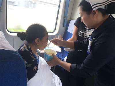 “大家搭把手,先把孕婦抬到空曠的車廂去,趕緊廣播找醫生;準備好熱水,準備好急救箱,通知餐車主任給孕婦準備點紅糖荷包蛋……”在現場,列車長袁慶向車上的其他工作人員有序安排工作。