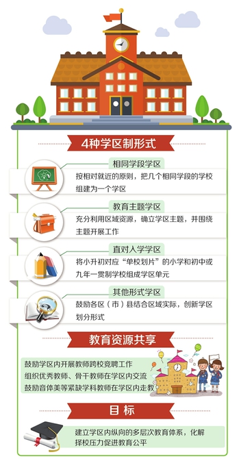 《意見》提出4種學區(qū)制建設形式,以相同學段學區(qū)為例,這種學區(qū)將按相對就近的原則,把幾個相同學段的學校組建為一個學區(qū),縮小相鄰學校教育教學質(zhì)量差距,實現(xiàn)相鄰學校協(xié)同發(fā)展,實現(xiàn)學區(qū)內(nèi)義務教育校際均衡。一般可分為小學學區(qū)和初中學區(qū)。