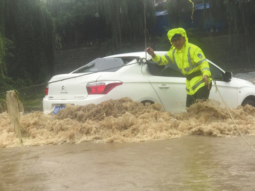 湍急的洪水中,綿陽交警不顧個人安危,涉水牽繩,合力將轎車拖上岸。綿陽交警供圖