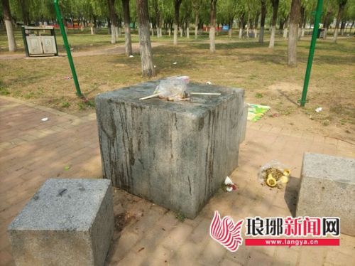 沂蒙晚報記者在北京路沂河大橋南側樹林里看到,總共6處休閑石桌凳上都有厚厚的油漬,其中有的石桌上還留著燒烤后遺棄的竹簽、烤串等。