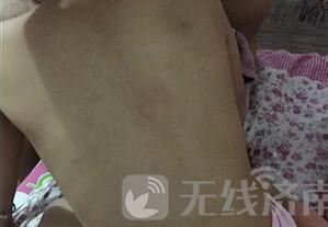 從這個女士昨晚拍攝的照片可以看出,四歲的小女孩陽陽的兩側肩膀、以及后背有多處青紅。看到孩子身上的傷,鄭女士和丈夫今天一早便來幼兒園查看了監控。