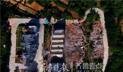 航拍的圖片清晰顯現出,此次開拆的別墅群位于濟南市飲水水源地錦繡川水庫南岸,四周風景秀麗,緊鄰紅葉谷景區,屬于典型的大型違建別墅群。齊魯晚報·齊魯壹點記者 周青先攝