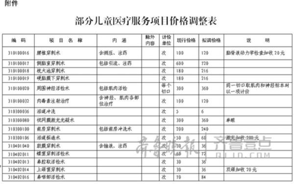 記者從煙臺市物價部門了解到,根據《關于印發〈貫徹國衛醫發〔2016〕21號文件加強兒童醫療衛生服務改革與發展工作方案〉的通知》(魯衛醫字〔2016〕31號)的要求,煙臺市調整部分兒童醫療服務價格。6歲(含)以下兒童手術價格,在現行價格基礎上提高20%。6歲(含)以下兒童一般治療操作、有創活檢、探查等項目價格,在現行價格基礎上加收20%。