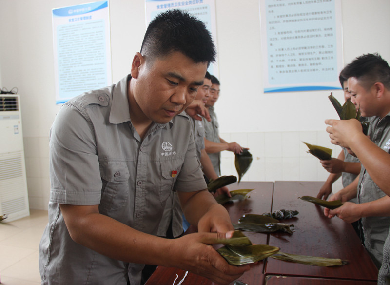 6月25日,端午節,中鐵十局集團電務工程有限公司電氣化第二項目部在當天下午施工結束后開展“端午粽飄香 駐守鐵路情”集體包粽子及廚藝大比拼活動。(央廣網發 李金文 攝)