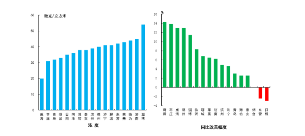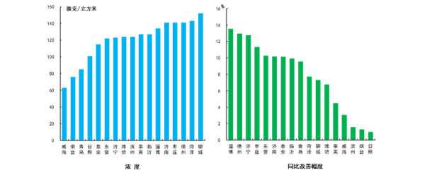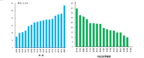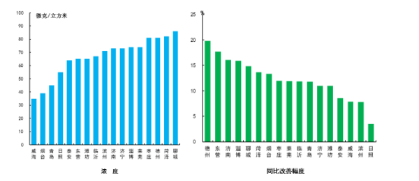細(xì)顆粒物濃度最好的城市是威海市,為35μg/m3,最差的城市是聊城市,為86μg/m3。17市均同比改善,改善幅度最大的是德州市,為19.8%。
