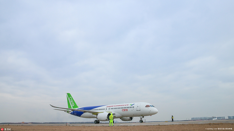 圖為12月28日,中國第一架C919大型客機進行低速滑跑測試,此次測試是為今后的順利首飛做鋪墊。