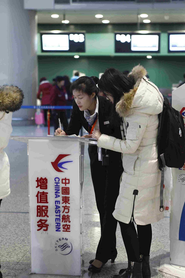 在上海虹橋浦東兩場,東航加大值機區(qū)域柜臺資源投放,充分利用移動值機和自助行李托運柜臺等現(xiàn)有資源設(shè)備,安排專門人員引導(dǎo)旅客,幫助旅客便捷辦理手續(xù)。在節(jié)日期間,東航將在空中和地面營造節(jié)日氛圍,開展特色活動,推出節(jié)日傳統(tǒng)美食,溫暖旅客的回家路。截至2016年底,東航已在53架寬體客機上開通了空中互聯(lián)服務(wù),每月開通空中互聯(lián)服務(wù)的航班近3500班,在帶給旅客空中“網(wǎng)上沖浪”體驗的同時,更可以在空中與家人問候拜年。