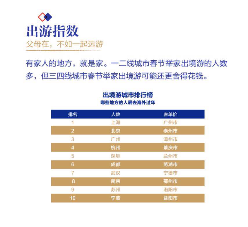 老話說:“父母在,不遠游!比缃,“父母在,一起游”。近年來,趁著春節假期跟家人一起到海外旅游過年也成為新年俗的重要組成部分。飛豬數據顯示,在“最喜歡去境外過年的城市”中,上海在全國所有城市中排名第一名。