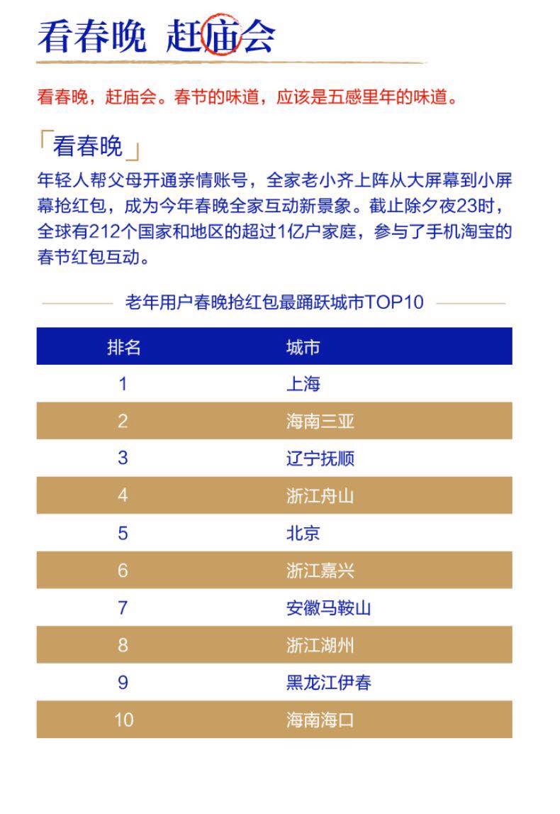 從阿里巴巴發布的整體數據看,傳統年俗在互聯網技術的加持下盛裝回歸:除夕夜,上億用戶和家人一起搶紅包,全球2.51億支付寶用戶集齊五福;帶父母出門年夜飯、出境游、看電影成為新潮流……