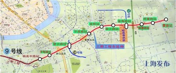 9號(hào)線三期東延伸(起自9號(hào)線二期工程終點(diǎn)楊高中路站,自西向東延伸,終點(diǎn)站曹路站),全長13.8公里、車站9座。目前全線結(jié)構(gòu)貫通,正在進(jìn)行軌道鋪設(shè)和車站裝修安裝施工。