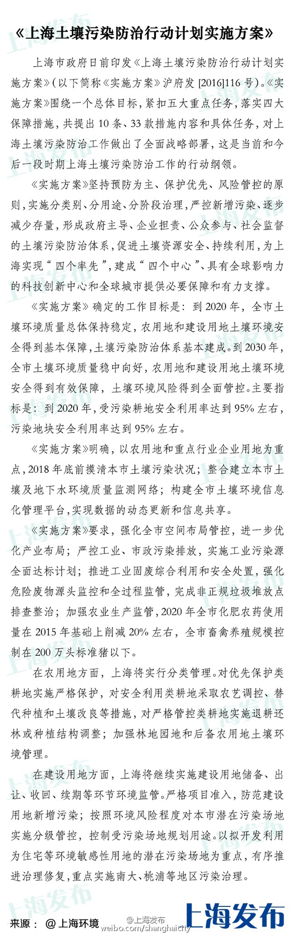央廣網上海1月6日消息 據上海發布,@上海環境公布《上海土壤污染防治行動計劃實施方案》,確定主要指標:到2020年,受污染耕地安全利用率達到95%左右,污染地塊安全利用率達到95%左右。同時,嚴控工業、市政污染排放,以擬開發利用為住宅等環境敏感性用地的潛在污染場地為重點,有序推進治理修復,重點實施南大、桃浦等地區污染治理等。