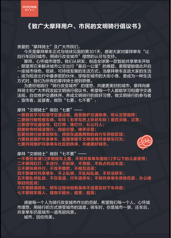 去年以來,以摩拜單車為代表的共享單車在城市中的涌現,極大方便了市民出行,解決了市民最后一公里的出行難題,讓自行車回歸城市,鼓勵更多人通過騎行改變城市,并因此深受廣大市民的歡迎。但與此同時,共享單車這一新生事物也檢驗著市民的規則意識和文明程度。摩拜單車希望通過此次全國范圍的文明騎行倡議活動幫助更多用戶主動了解交通規則,激起更多人的文明意識和責任意識,讓用戶能自覺養成文明的用車習慣,助力城市文明交通建設,樹立行業典范,讓共享單車行業的健康有序發展。