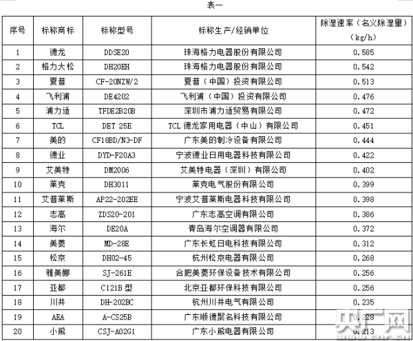 在除濕速率(名義除濕量)上,20件樣品差異較大。測試結果顯示,數值最高達到0.585 kg/h,最低為0.213 kg/h,相差近2倍,其中3件樣品的數值在0.5 kg/h以上,除濕效果上佳;6件樣品在0.3 kg/h以下,除濕效果較低。(詳見表一)。