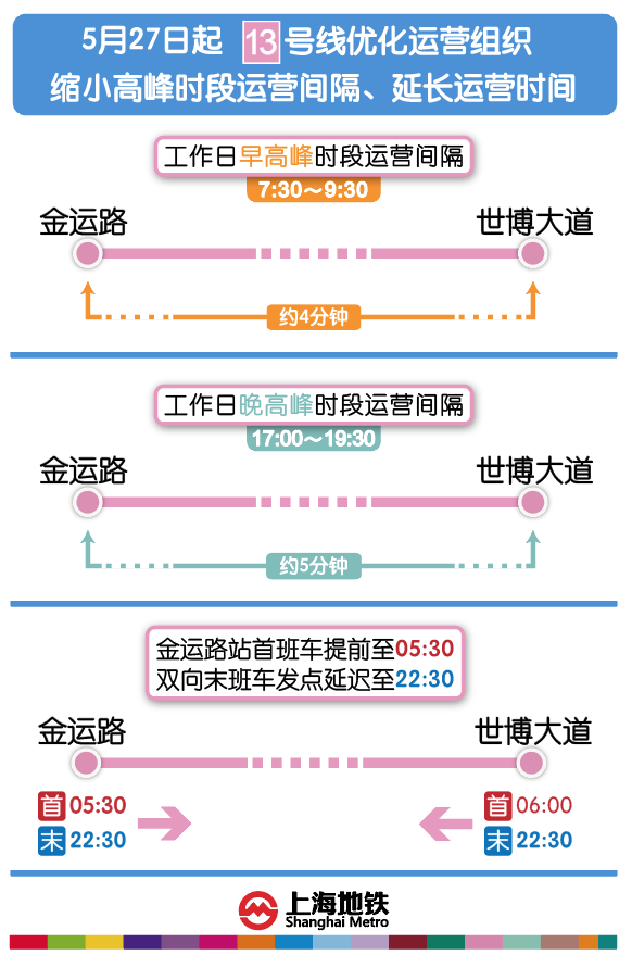 另外,針對網(wǎng)友反映的13號線末班車時間結束較早的問題,地鐵運營方也是高度重視。5月27起,13號線延長了全天運營時間,根據(jù)計劃:啟用新列車運行圖后,13號線金運路站的首末班車時間由原先的5:50和22:11,調整為5:30和22:30,調整后金運路往世博大道方向全天運營時間增加39分鐘;而13號線世博大道站的首班車時間維持在6:00不變,末班車時間由原先的22:08調整為22:30,調整后世博大道往金運路方向全天運營時間增加了22分鐘。