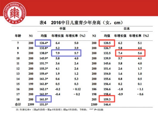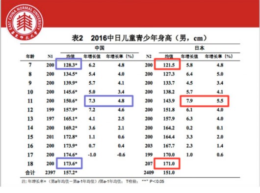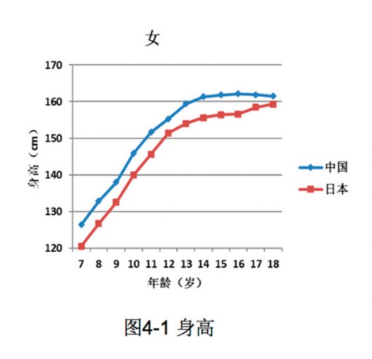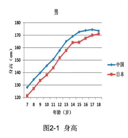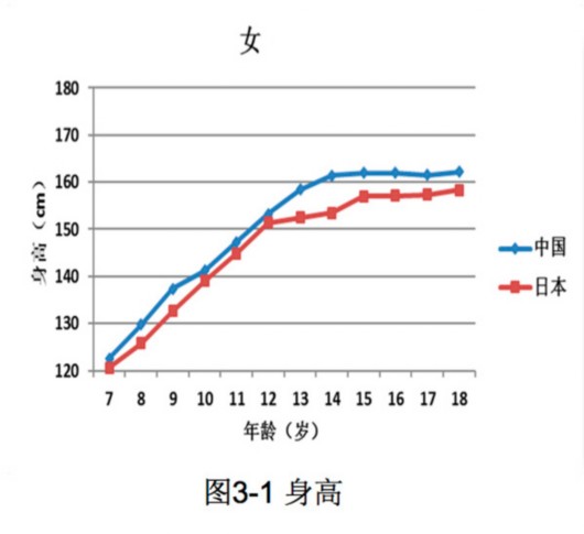 譬如,7-18歲中日兒童青少年(男)身高統計中,除12歲外,中國男生均顯著高于日本男生。中國女生各年齡段也均顯著高于日本女生。