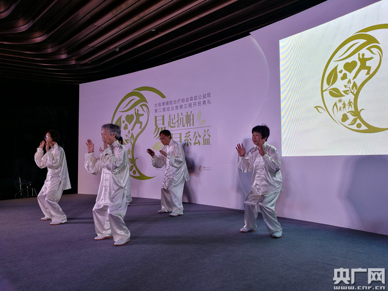 活動現場,來自二期公益班的學員們上臺進行了太極拳匯報表演,精準流暢的招式讓人很難想像他們是患帕金森癥多年的病人。練習太極拳多年的郭廣昌也親自上場,與帕友們分享練習太極拳的心得,并帶領大家一起打起了太極拳。
