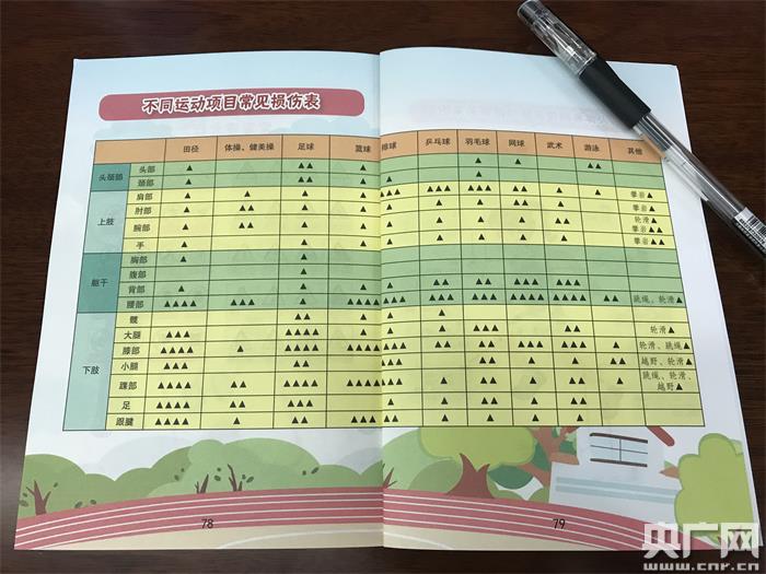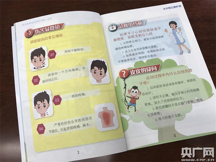 據介紹,該《學生體育運動安全手冊》編寫遵守了三個原則:一是編寫基于身體部位和運動項目相結合的“二維”查詢系統,方便學生查詢使用;二是堅持“點”“面”結合,“面”是全面呈現中小學體育運動傷害預防的科學知識,“點”則指針對具體運動項目或身體部位講解預防知識和科學方法;三是符合中小學生身心發展特點和認知規律,圖文并茂呈現。
