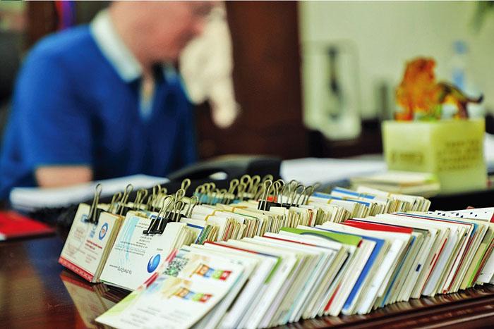 嘉定工業區經濟發展有限公司副總陳建忠桌上擺滿了出去招商交換來的名片。