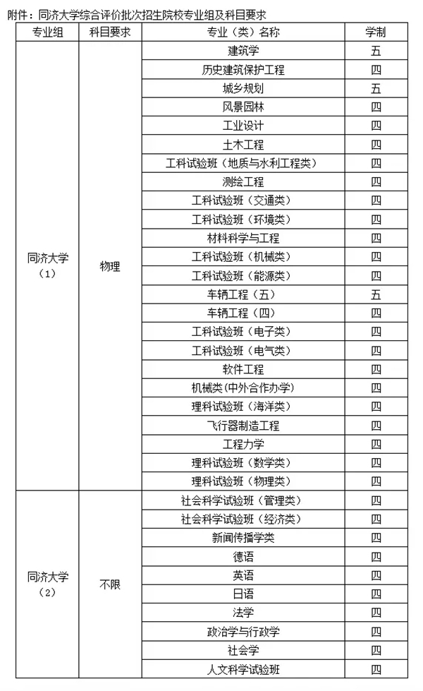 同濟大學綜合評價批次招生院校專業組及科目要求
