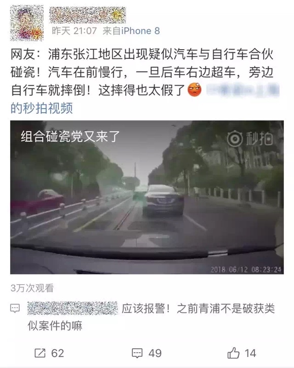 “浦東張江地區出現疑似汽車與自行車合伙碰瓷!汽車在前慢行,一旦后車后邊超車,旁邊自行車就摔倒!”近期,有不少網友在網上發帖揭露新型碰瓷套路。