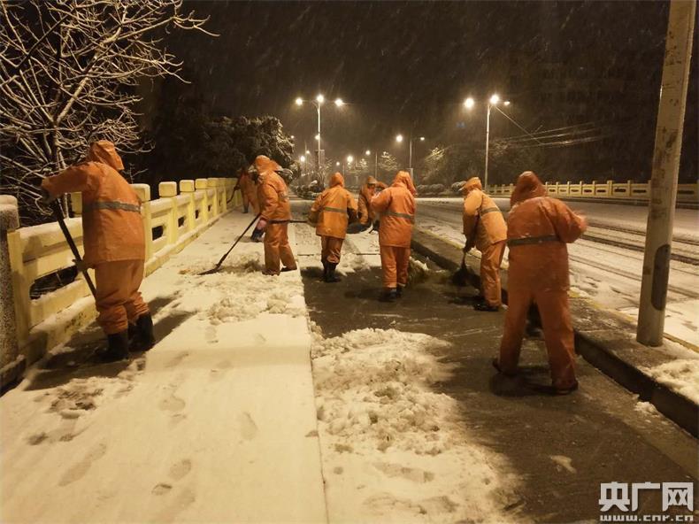 環(huán)衛(wèi)保潔人員連夜開展除雪工作(央廣網(wǎng)發(fā) 上海綠化市容局 供圖)