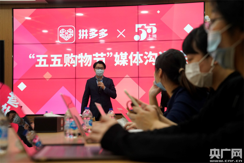 4月23日,拼多多宣布,將投入15億元現金及補貼,聯合10000家上海品牌和企業,全力支持上海市“五五購物節”。拼多多高級副總裁王堅正在介紹平臺助力“五五購物節”的具體舉措。(本文圖片:央廣網發 李勝 攝)