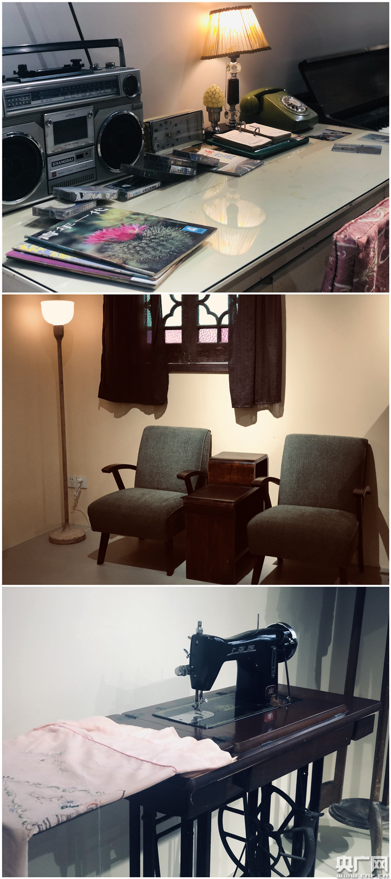 記者在現(xiàn)場看到,三個客廳里的布置與物件均有出處,有跡可循。收音機、熱水瓶、電風(fēng)扇、臺燈……雖然只是一些日常的實用物件,卻依附著一個個普通上海人的成長經(jīng)歷,濃縮了一組組家庭的情感故事。
