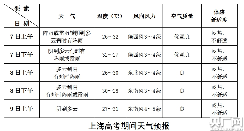 上海市氣象局提醒,高考期間,由于濕度大、氣溫高,體感悶熱,請保持考場空氣流通,適當準備清涼物品。7~8日有陣雨或雷雨,需做好相關人員的避雨、雷電防護安排。