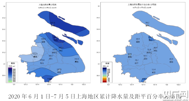 自6月1日入汛以來,上海全市平均累計降水量為378.4毫米(截止到7月5日),較常年(1981-2010年)同期偏多近8成,占常年汛期雨量(6-9月,614.0毫米)的6成以上。市區(qū)徐家匯站為354.1毫米,較常年同期偏多5成;郊區(qū)在302.7(青浦)-466.5(寶山)毫米之間,較常年同期偏多4成-1.2倍。目前,上游太湖流域已出現(xiàn)超警戒水位。