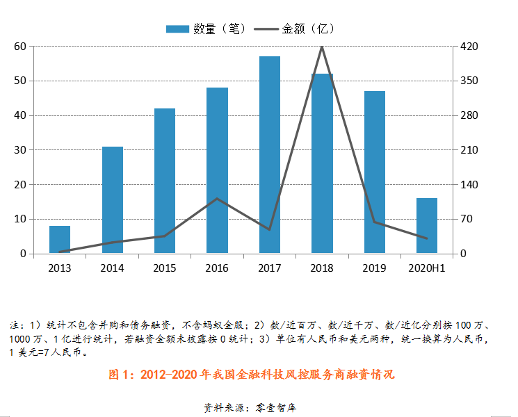 據報告數據顯示,2013-2019年間我國金融科技風控廠商融資事件數整體呈逐年上升的趨勢,2017年達到峰值,融資事件為57起;但從2018年開始,連續兩年出現下滑趨勢,2019年融資事件數為47起。融資金額整體呈現增長趨勢,2018年披露事件的融資總額最高,為418.6億元,2019年融資金額為63.5億元。