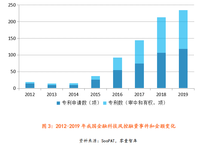 在專利方面,根據SooPAT數據顯示,自2014年開始,國內與金融科技風控相關的專利申請持續上升。2014年金融科技風控專利申請數為10項,2019年申請數達到118項,5年間專利申請數年復合增長率達63.82%。其中,在2012年至2019年間,阿里巴巴及支付寶共申請27項金融科技風控專利,涉及支付、投資決策、賬戶安全、信貸等場景應用,是申請專利最多的企業。
