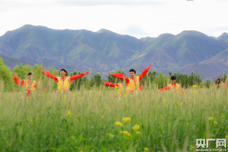 藏族小伙在綠麥草地上跳舞