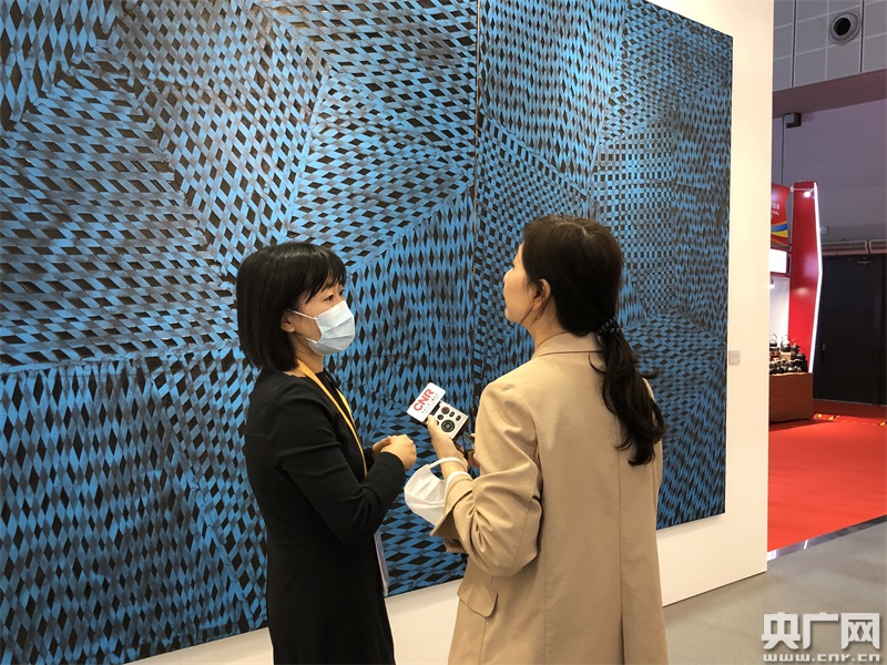 西班牙全球藝術時代(Global Artera)公司的合伙人馬科星女士接受總臺央廣記者專訪,并介紹展品(央廣網發 受訪者供圖)