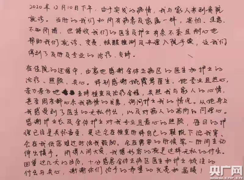12月16日,一婦嬰西院產(chǎn)科五病區(qū)收到一封來自患者小妍(化名)的感謝信,言辭懇切。“每日的護(hù)理已經(jīng)是關(guān)懷備至,還會(huì)在檢查時(shí)將自己的鞋脫下來給我穿,會(huì)在我低落難過時(shí)給我鼓勵(lì),會(huì)在需要的時(shí)候第一時(shí)間主動(dòng)伸出援手。所謂人間大愛,我想形容的就是這樣無私的付出。”