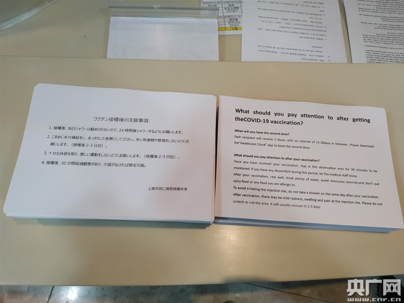 現場為外籍人士準備了接種后注意事項說明,有英語和日語兩個版本。(央廣網記者林馥榆 攝)