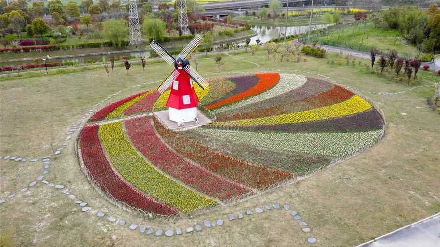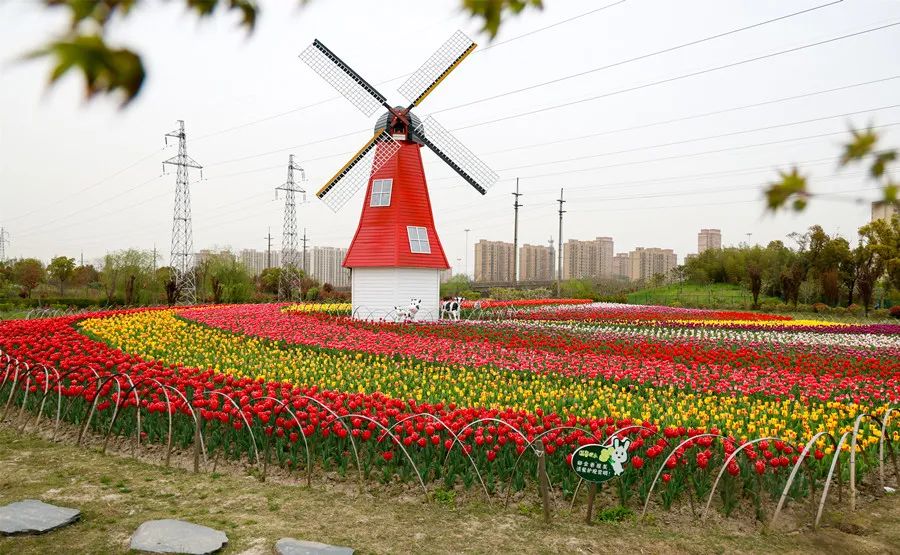 在菊園百果園,五彩斑斕的郁金香朵朵飽滿,宛如酒杯,在微風中與大風車造景相映成趣,形成了獨具特色的“小荷蘭”景觀。