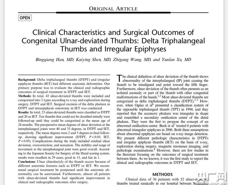 央廣網上海4月12日消息(記者楊靜 通訊員姜蓉)近日,國家兒童醫學中心(上海)、上海交通大學醫學院附屬上海兒童醫學中心骨科副主任醫師徐蘊嵐團隊正式公布一項最新臨床創新成果——一種關于拇指尺偏畸形的新型手術矯正方法。該項成果近期已于《Journal of Pediatric Orthopaedics》發表,該雜志是北美兒童骨科協會官方雜志、國際兒童骨科領域頂尖專業標桿期刊,該文章也是近十年來上海小兒骨科專業領域首次被其收錄的研究成果。