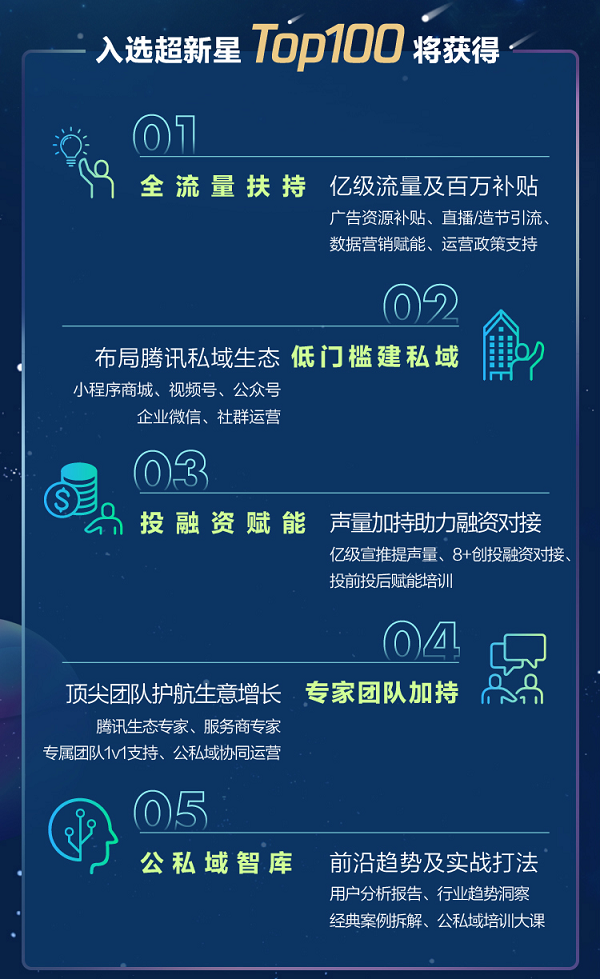 參與“域見超新星”計劃的新銳品牌,將獲得騰訊及生態伙伴共同帶來的“全流量扶持、低門檻建私域、投融資賦能、專家團隊加持、公私域智庫”五大扶持措施,覆蓋新銳品牌在全商業生命周期中不同階段所需的能力與資源建設,讓品牌快速跑通騰訊交易場內的長期商業鏈路,步入增長正軌。